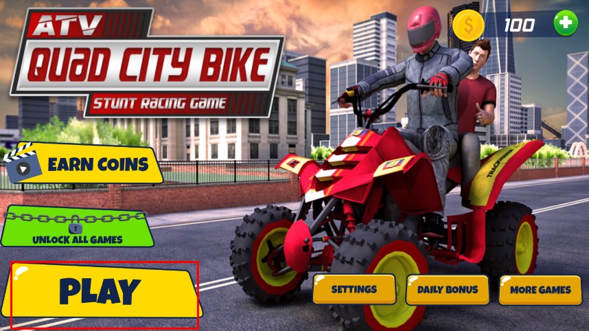1、点击【PLAY】,进入【四人城市赛车】,开启四轮摩托特技竞速。