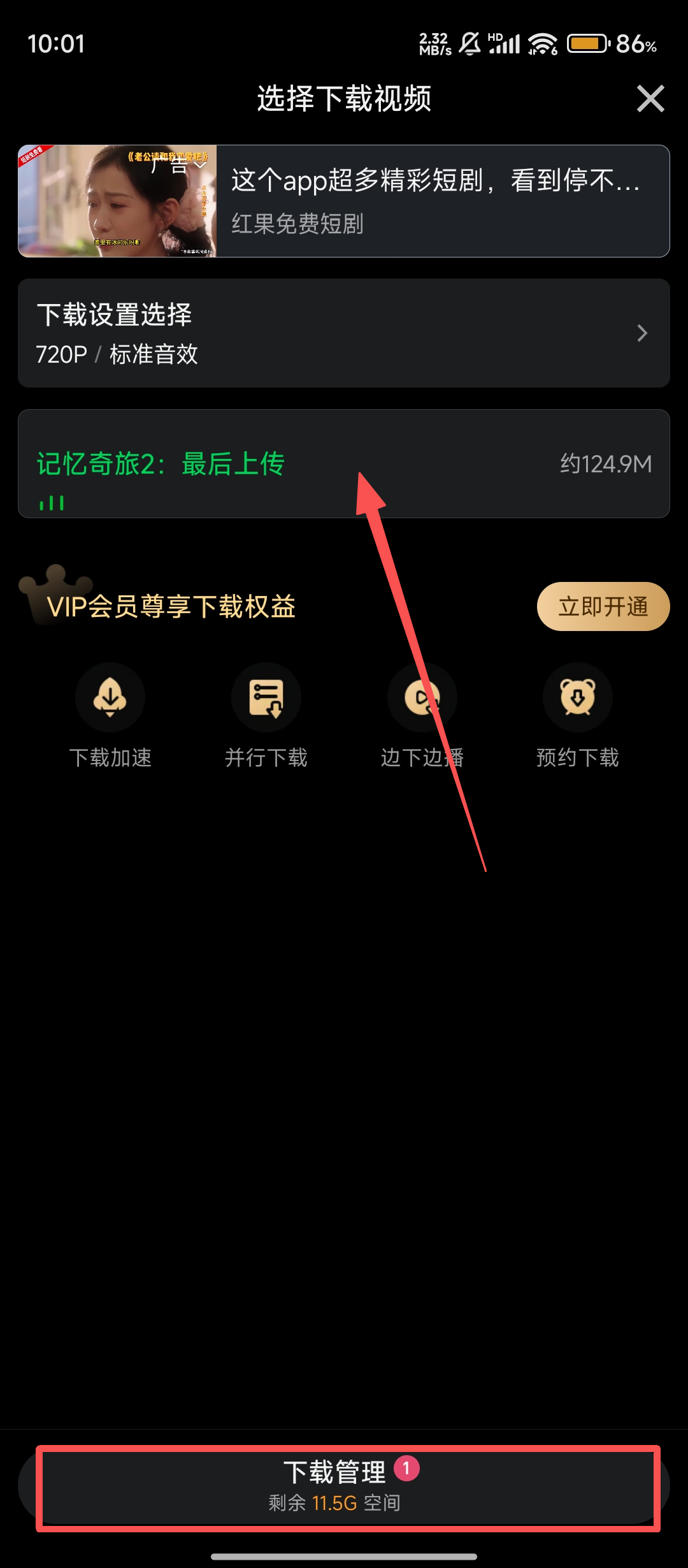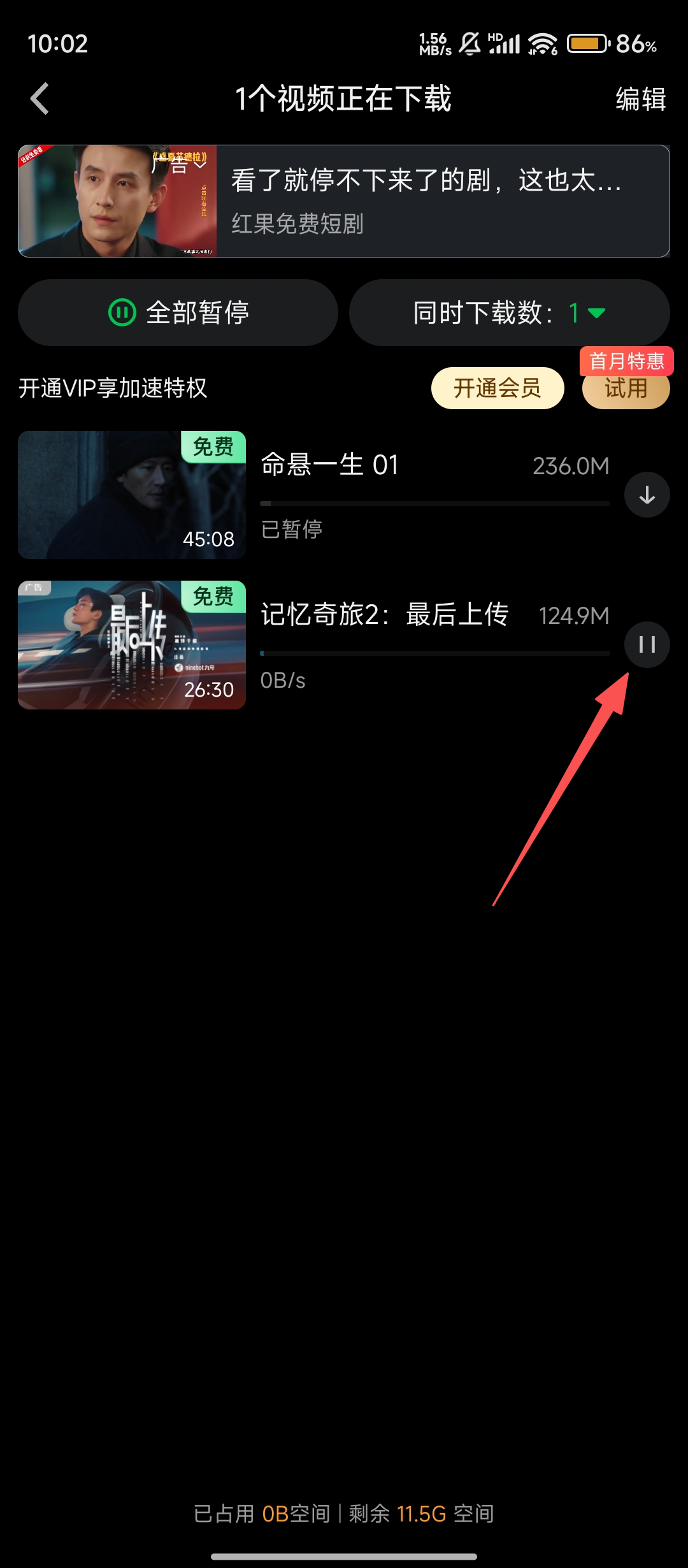 4、进入下载管理页,能看到视频下载进度,若想暂停,点击视频右侧的暂停按钮就行,方便又快捷呢。