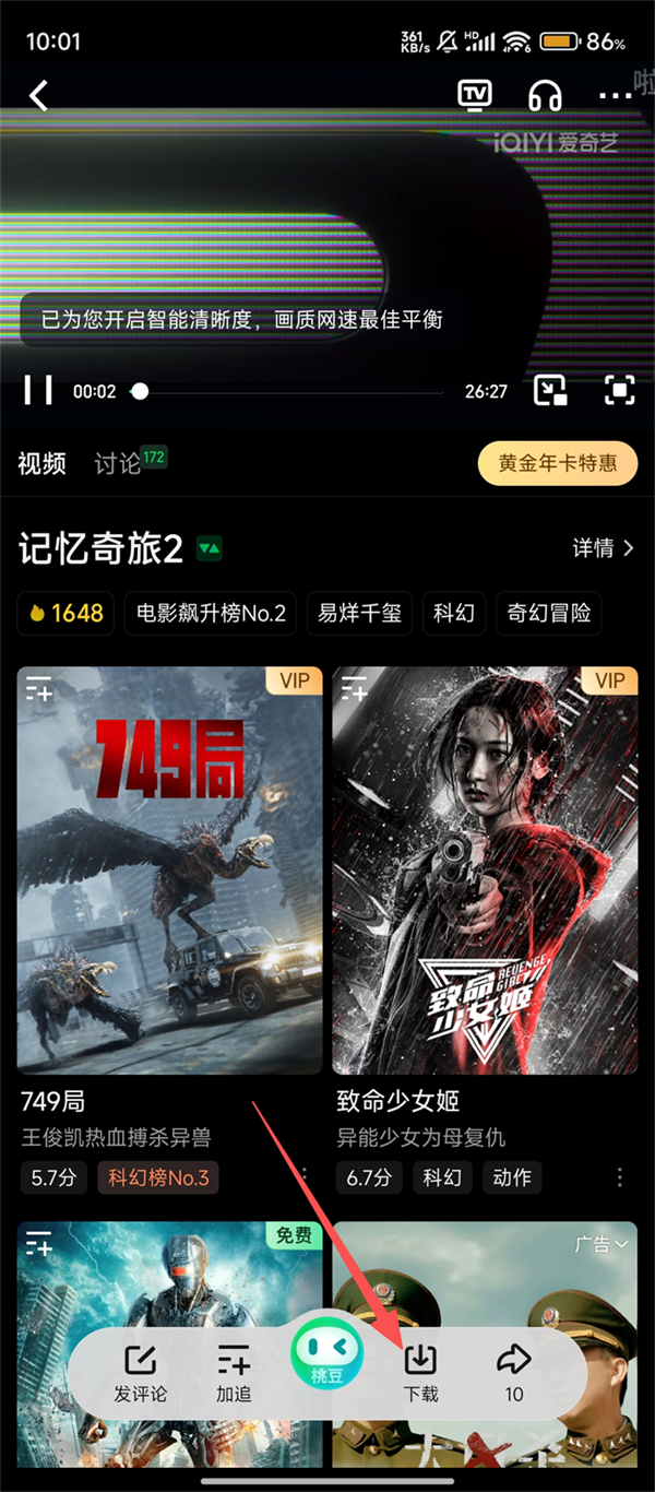 2、进入影片播放页后,我们轻点下方的【下载】,即可进入下载界面啦。