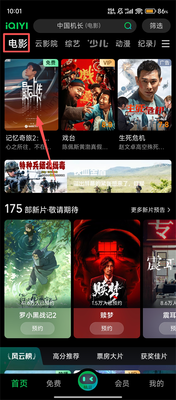 1、打开爱奇艺,在【电影】分类里挑选想看的影片,比如点击带【免费】标识的海报,就能进入播放页啦。