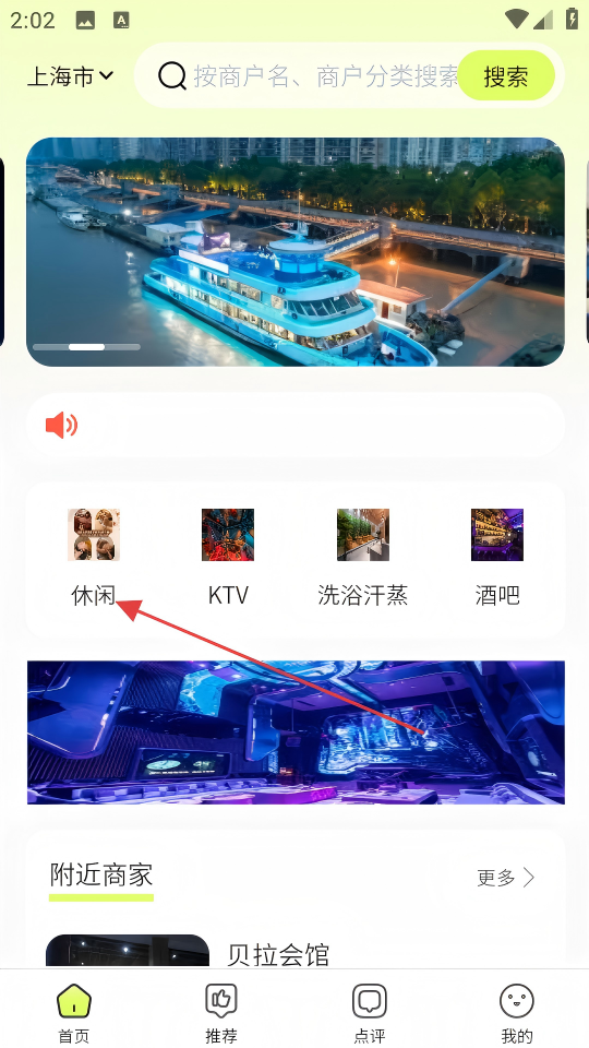 2、在休闲类别商户列表中,点击“贝拉会馆”,进入其详情页。