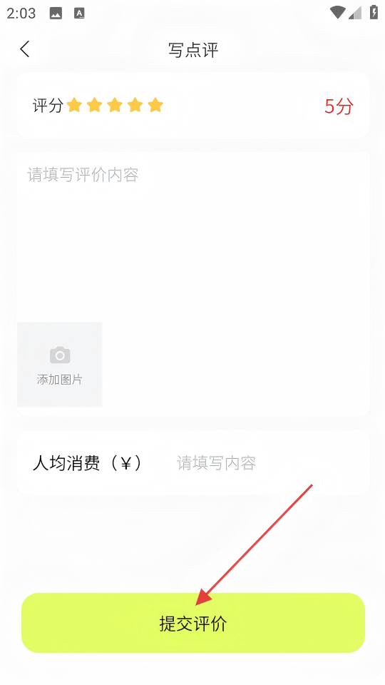 4、进入写点评页面,进行评分、填写评价内容、添加图片,点击【提交评价】,完成评论。