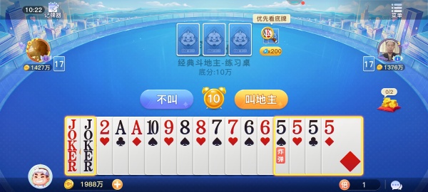 1、在經典模式中,采用的是“叫地主”的方式來爭奪地主權,這裏根據牌型,手握兩幅炸彈,雖然副牌也不錯,所以選擇了叫地主;