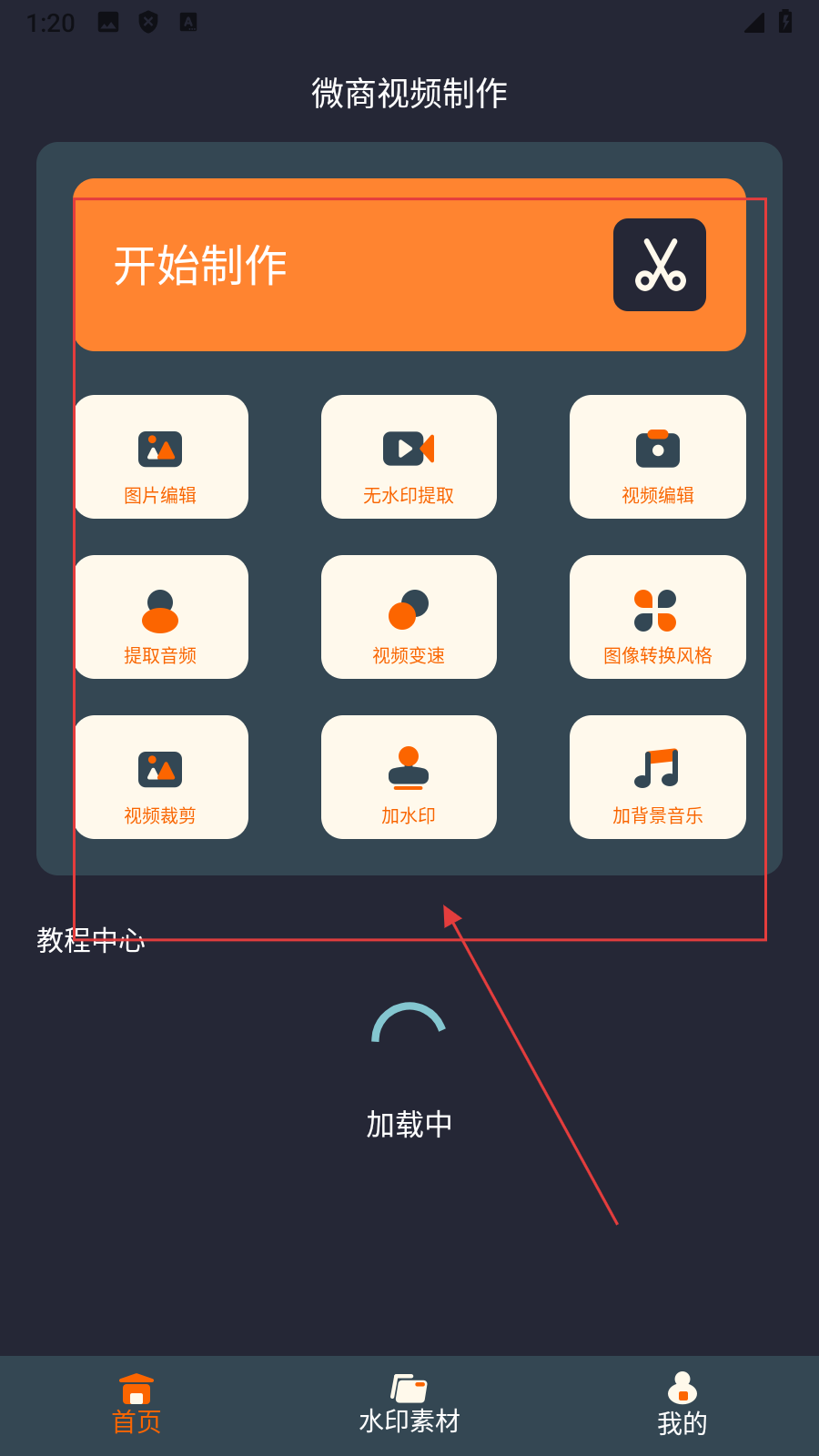 1、进入首页,可使用【开始制作、图片编辑、视频编辑】等功能,开启微商视频制作。