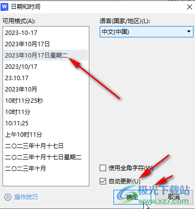 第四步:切换语言后,就可以在左侧选择想要的日期格式了,点击勾选“自动更新”并确定;