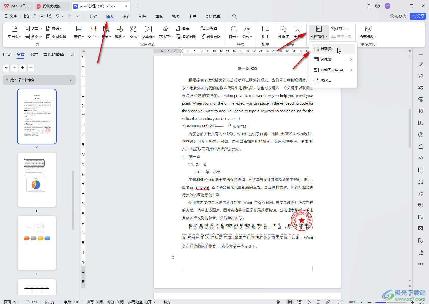 第二步:在“插入”选项卡中点击“文档部件”——“日期”;