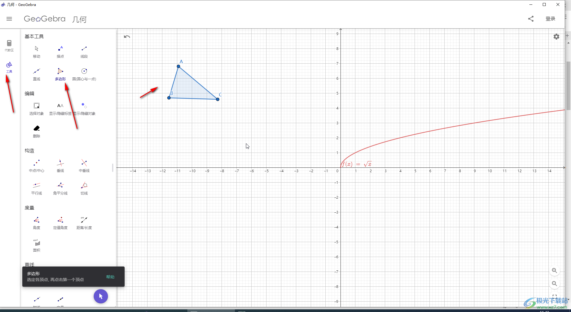 第二步:在左上方点击“工具”,然后使用各种工具自由绘制图像,比如我们这里点击“多边形”后,任意点击几个点,然后点击起始点得到封闭图形;