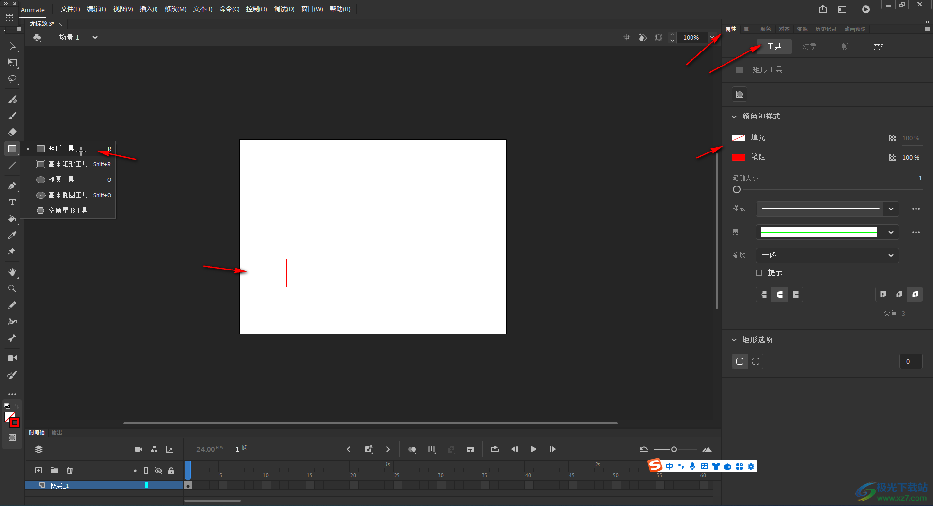 第一步:进入编辑界面,在左侧长按图标找到并点击“矩形工具”,在右侧点击“属性”——“工具”,根据自己的需要设置填充,笔触等参数,拖动鼠标左键绘制矩形;