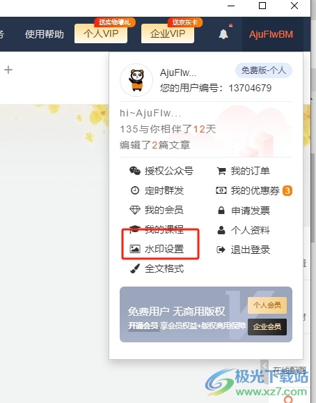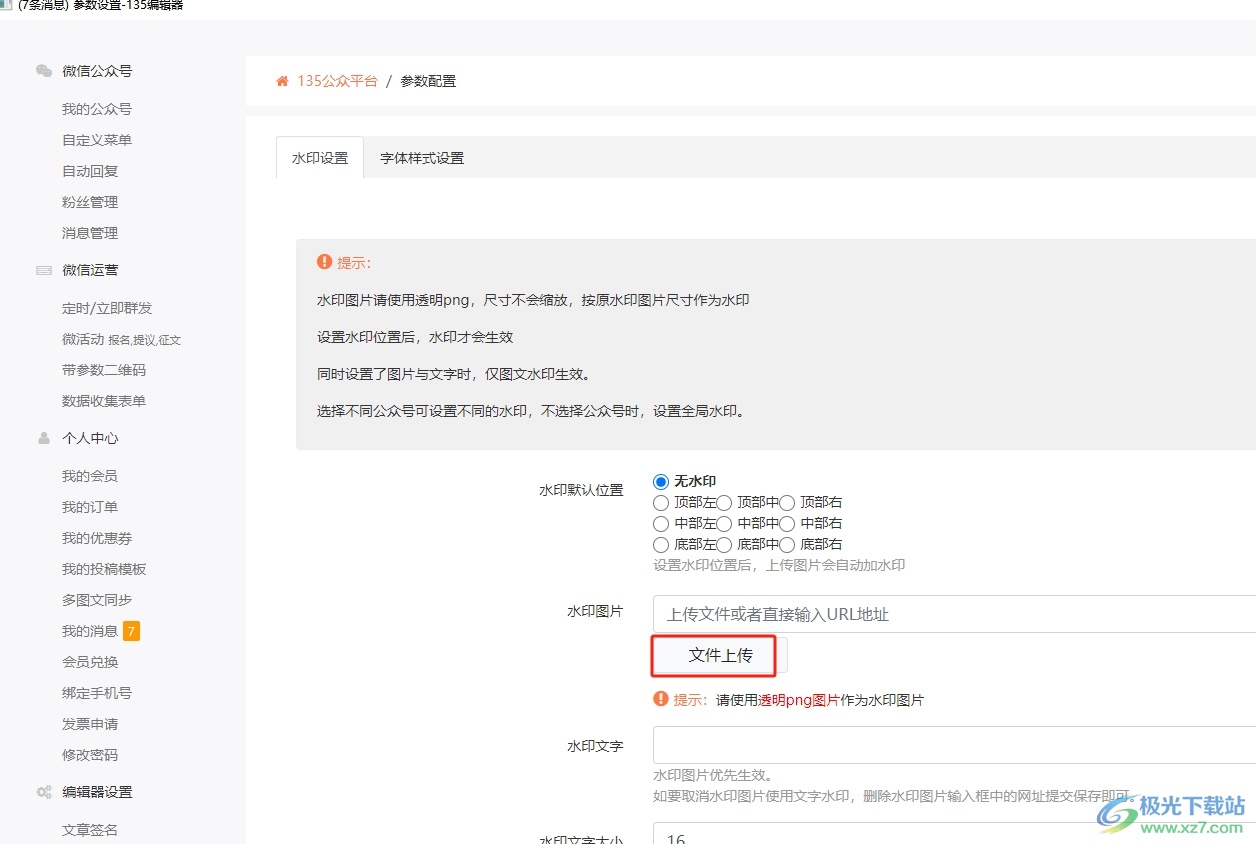 135编辑器是一款非常实用的文章自动排版工具,主要向用户提供了即时刷图、云草稿、全文配色、一键排版等功能,而且还有着丰富的模板和素材,很好的为需要编辑文章的用户提供全面的服务,因此135编辑器软件收获了不少用户的喜欢和称赞,当用户在使用135编辑器软件时,可以根据自己的需求来设置图片水印,这样就会避免他人盗用自己图片的问题,这个问题其实是很好解决的,用户直接在个人信息板块中点击水印设置选项,接着在打开的设置窗口中用户在图片水印中按下上传文件按钮来添加图片,然后设置好水印所在的位置后即可解决问题,那么接下来就让小编来向大家分享一下135编辑器设置图片水印的方法教程吧。