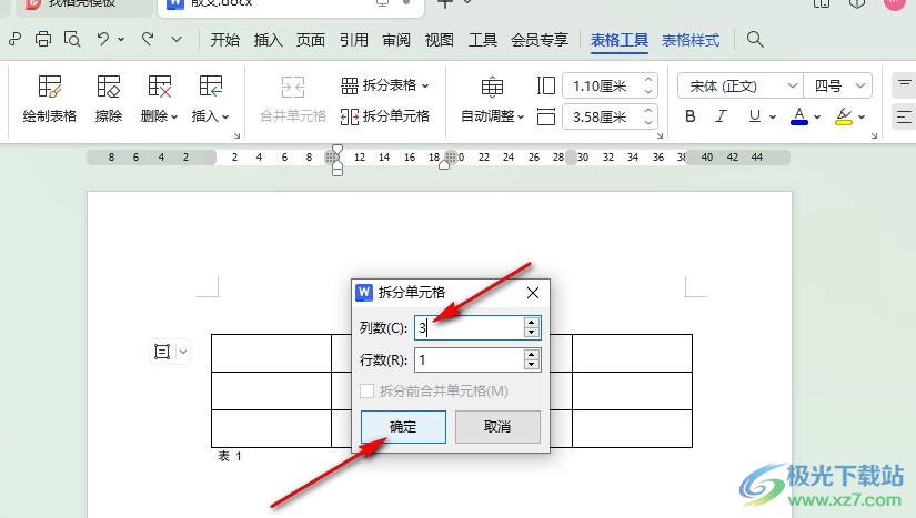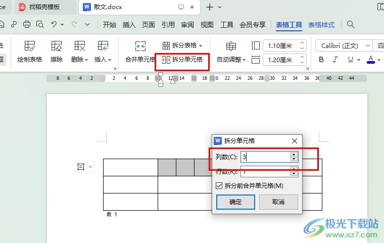 以上就是小编整理总结出的关于WPS Word把一个单元格拆分成三个单元格的方法,我们在WPS中点击一个单元格,然后在表格工具的子工具栏中打开拆分单元格选项,接着在弹框的列框中输入“3”,最后点击确定选项即可,感兴趣的小伙伴快去试试吧。