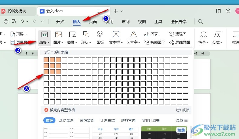2、第二步,进入WPS页面之后,我们在插入工具的子工具栏中打开表格工具,然后在下拉列表中选择自己需要的表格行数和列数