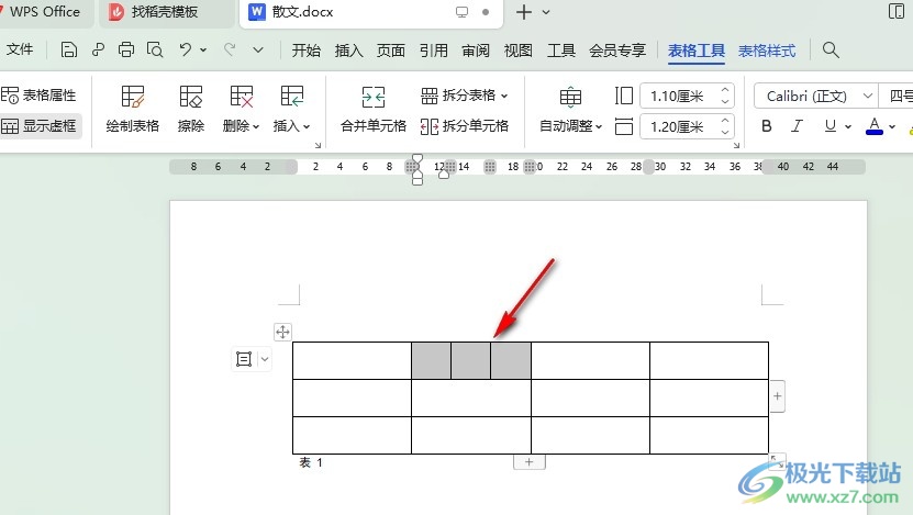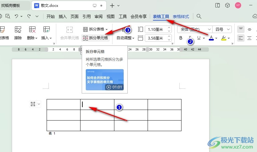 3、第三步,插入表格之后,我们点击表格中的一个单元格,然后在表格工具的子工具栏中打开“拆分单元格”选项