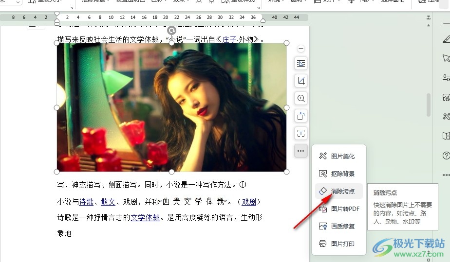 以上就是小编整理总结出的关于WPS Word给图片加马赛克的方法,我们在WPS中点击图片,再点击工具栏中的消除污点选项,接着在消除污点弹框中点击马赛克选项,再对图片进行马赛克添加,最后点击覆盖原图选项即可,感兴趣的小伙伴快去试试吧。
