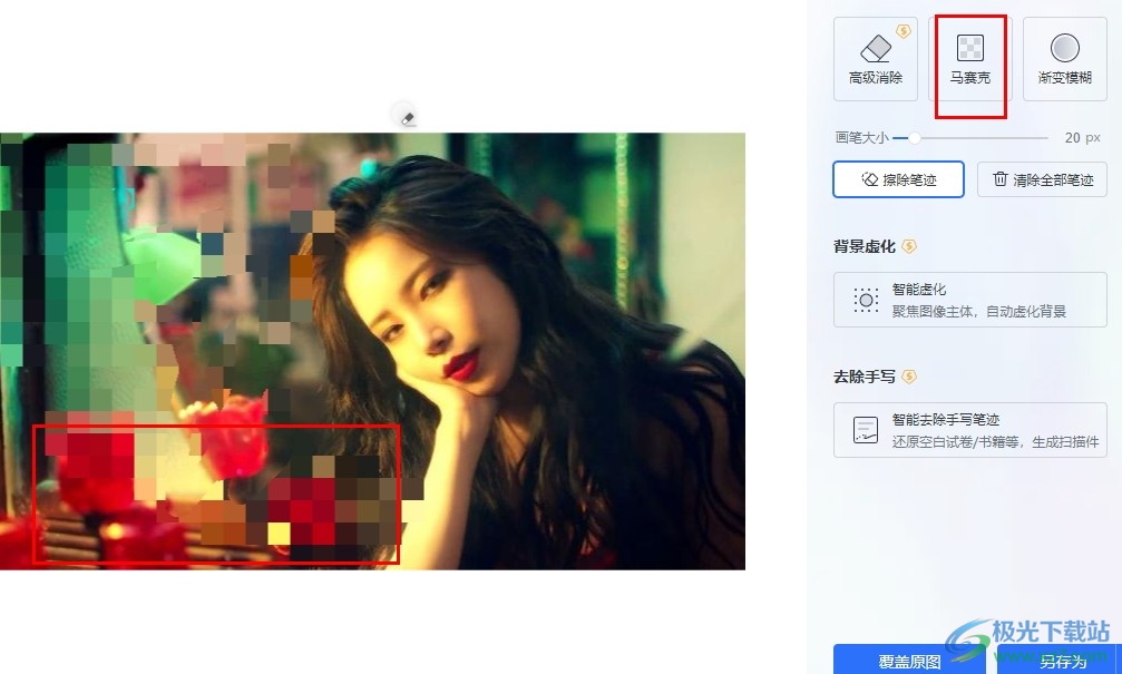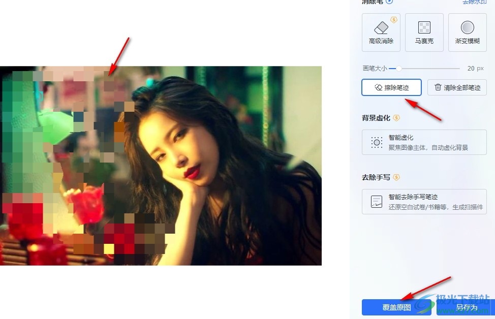 5、第五步,想要撤销马赛克时我们可以点击撤销按钮,也可以使用擦除笔记工具进行图片恢复,最后我们点击覆盖原图选项或是另存为选项保存添加好马赛克的图片即可
