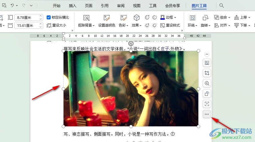 2、第二步,进入WPS页面之后,我们在文档中点击插入的图片,然后在右侧工具栏中打开“。。。”图标