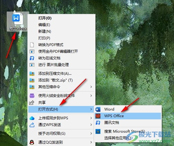 1、第一步,我们右键单击一个文字文档,然后在菜单列表中点击打开方式选项,再在子菜单列表中选择WPS office选项