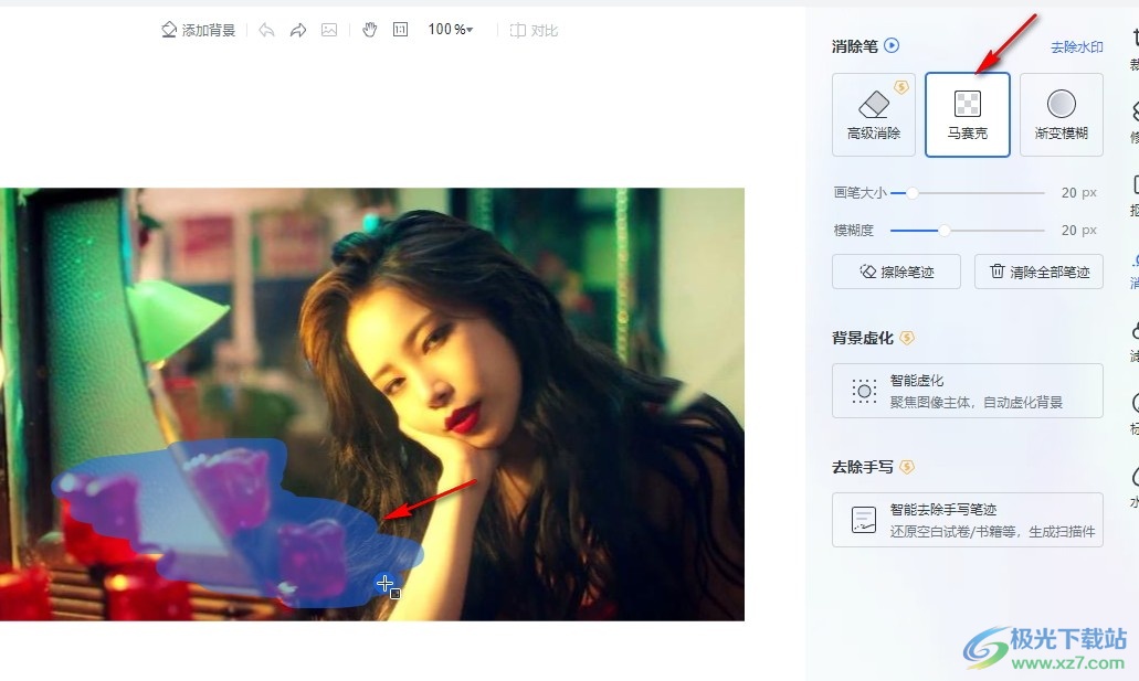 4、第四步,进入消除页面之后,我们将消除笔改为“马赛克”,然后在图片中涂抹需要添加马赛克的地方