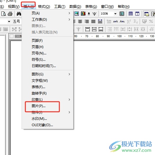 2.在菜单栏中点击插入选项,弹出下拉框后选择其中的图片选项,进入到文件夹窗口中