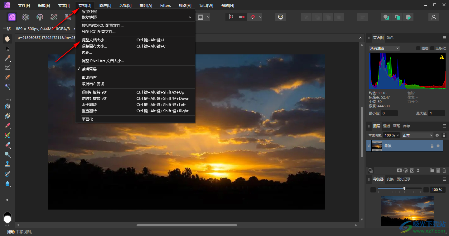 2.当我们将图像添加进来之后,直接在页面的顶部的菜单栏中将【文档】选项进行点击,之后再点击【调整文档大小】选项。
