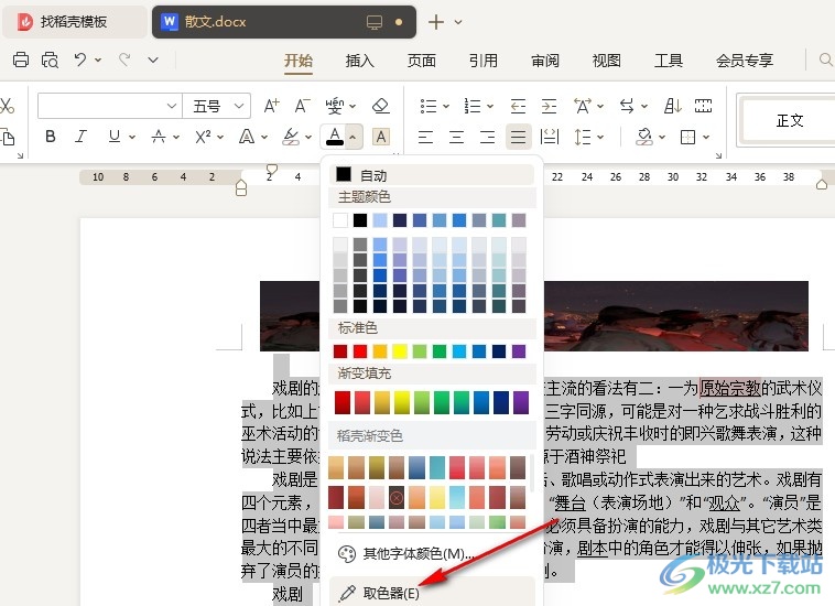以上就是小编整理总结出的关于WPS Word使用取色器更改文字颜色的方法,我们在WPS中打开一个文字文档,然后选中全文,接着在“开始”的子工具栏中,我们点击打开“字体颜色”工具,然后在下拉列表中点击取色器选项,最后在文档页面中直接选取自己需要的颜色即可,感兴趣的小伙伴快去试试吧。