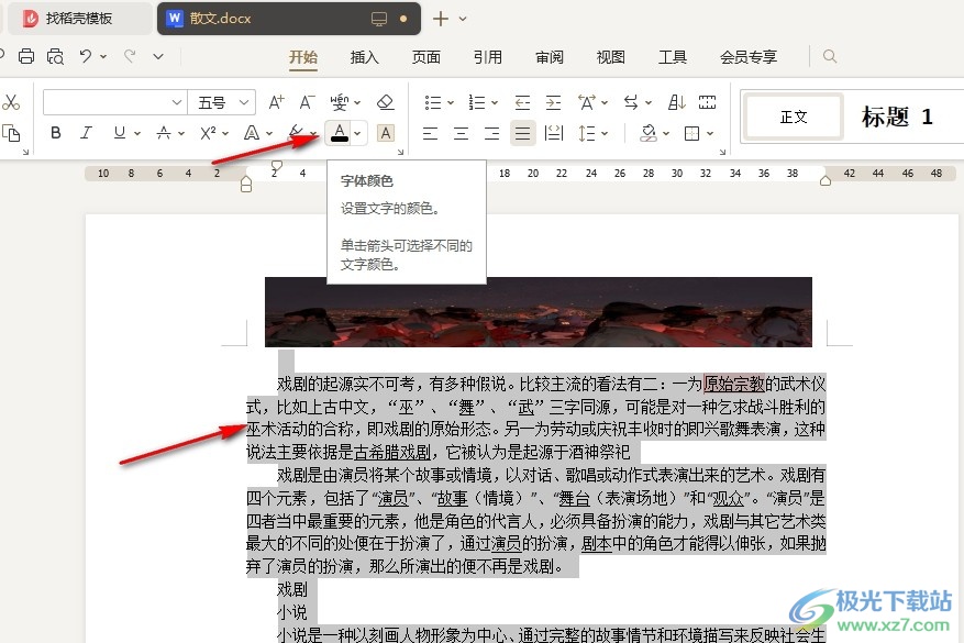 2、第二步,在文档的编辑页面中,我们使用“Ctrl+A”快捷键选中全文,然后在“开始”的子工具栏中打开“字体颜色”工具