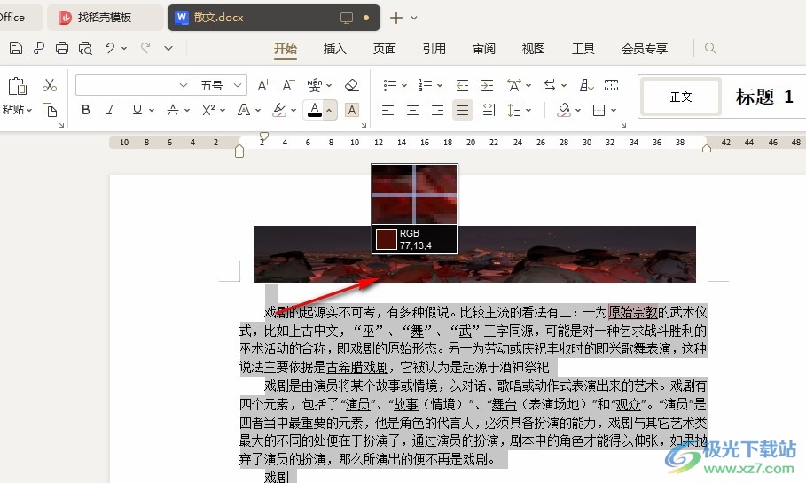 很多小伙伴在对文字文档进行编辑时都会选择使用Wps软件,因为在wps软件中我们可以使用更多工具对文字文档进行编辑。当我们需要的文字颜色在WPS的字体颜色列表中无法找到时,我们还可以选择使用取色器工具,使用该工具在文档页面中选取自己需要的颜色,直接进行使用。找到取色器工具的方法也很简单,我们全选文档之后,打开字体颜色工具,然后在下拉列表中就能看到取色器工具了,点击使用该工具即可。有的小伙伴可能不清楚具体的操作方法,接下来小编就来和大家分享一下WPS Word使用取色器更改文字颜色的方法。