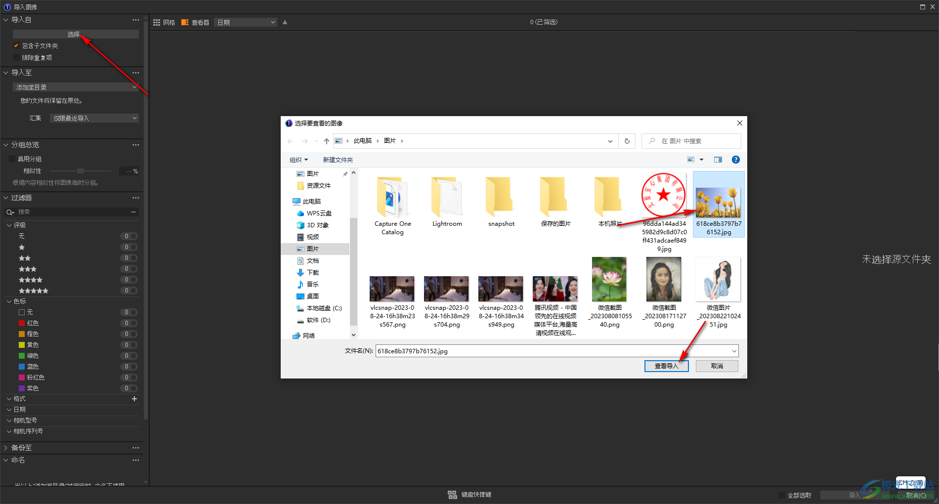 2.进入到导入的设置窗口中,点击左侧的导入自的【选择】按钮,就可以弹出一个文件夹页面,选择自己需要设置的图像进行添加。