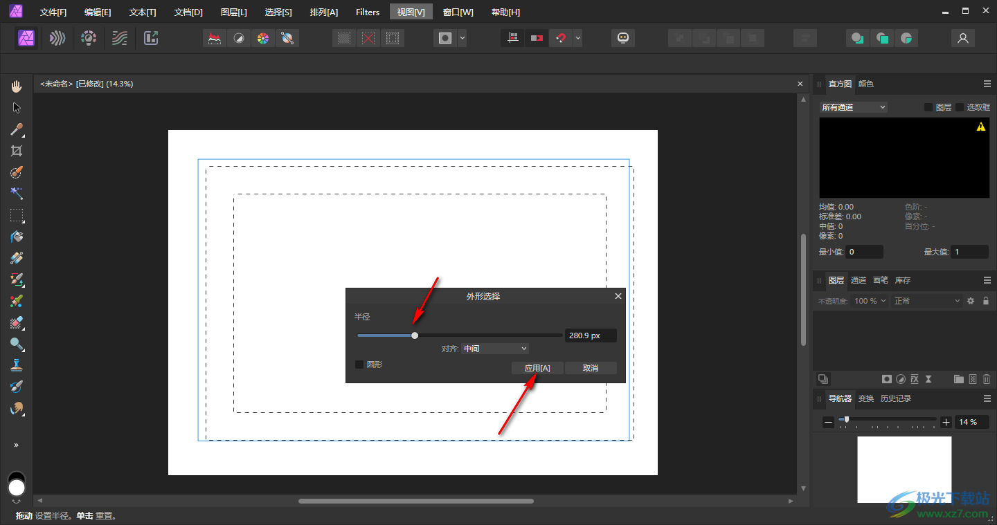 5.在页面上会弹出一个设置外形的选择框,我们用鼠标左键调整一下半径,向右拉动半径滑动条,之后点击应用按钮。
