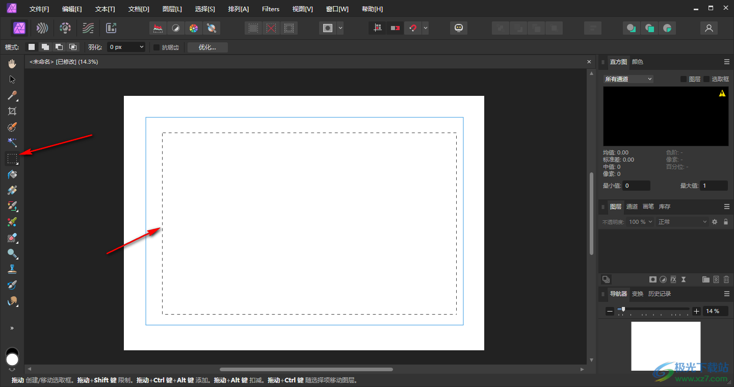 2.之后我们就可以直接在左侧的竖排工具中找到【矩形选区框工具】,将该工具图标进行左键点击一下,之后在空白的文档中进行探框选出一个矩形。