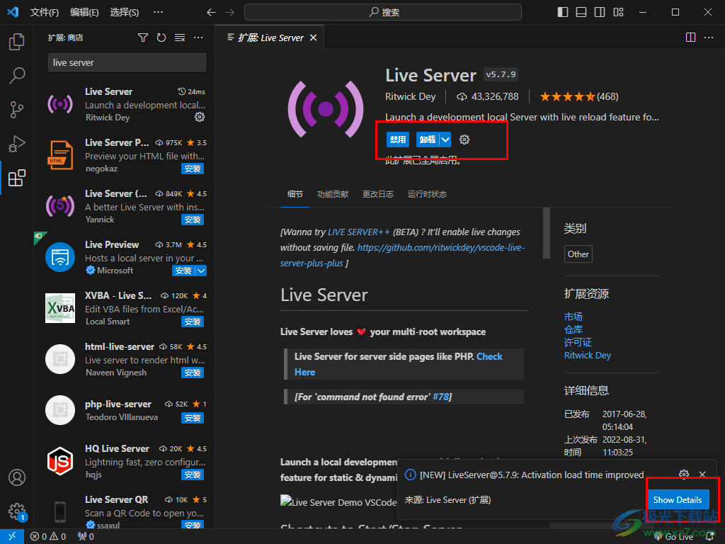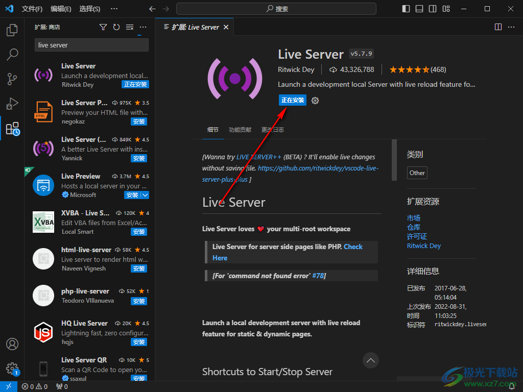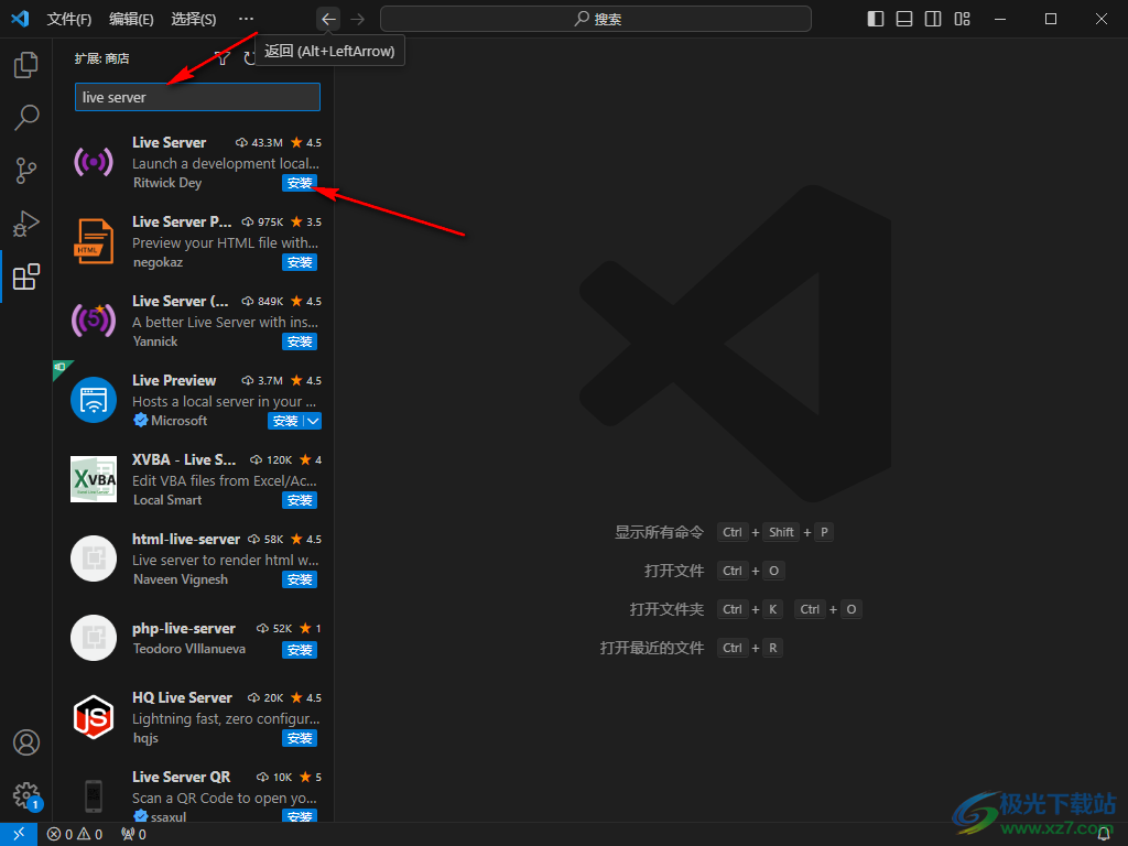 3.随后在右侧即可弹出一个搜索框,我们需要在搜索框中输入【live server】,之后会自动的弹出相关的选项,将其点击安装即可。