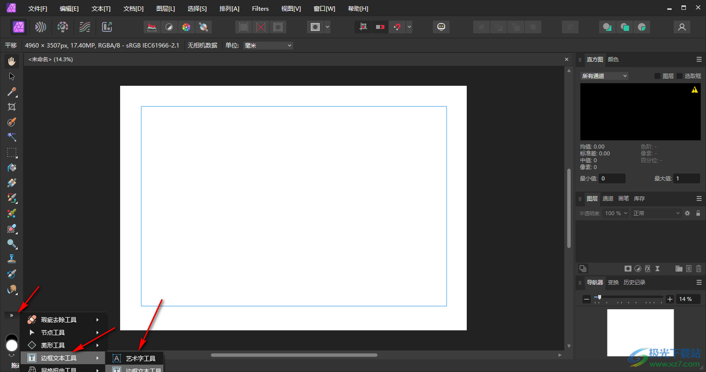 1.首先,我们需要进入到新建的文档页面中,点击左侧下方的箭头图标,依次单击打开【边框文本工具】-【艺术字工具】。