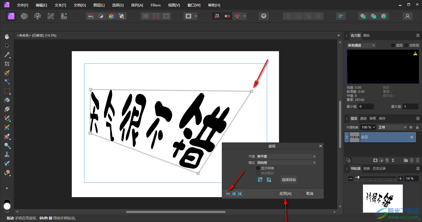 4.随后会弹出一个透视窗口,你可以在该窗口左下角的位置选择一个透视样式,之后用鼠标在文字编辑框的四个点进行随意的拖动即可变换文字,之后点击应用按钮。