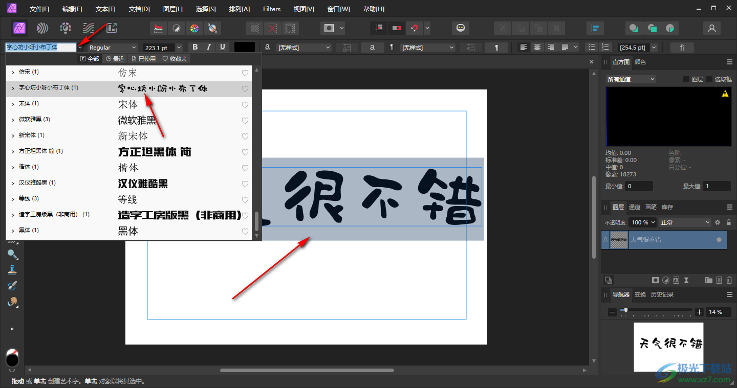 2.之后在页面上框选出编辑框并进行文字的编辑,然后在页面的工具栏中选择自己喜欢的字体样式应用到文字上,如图所示。