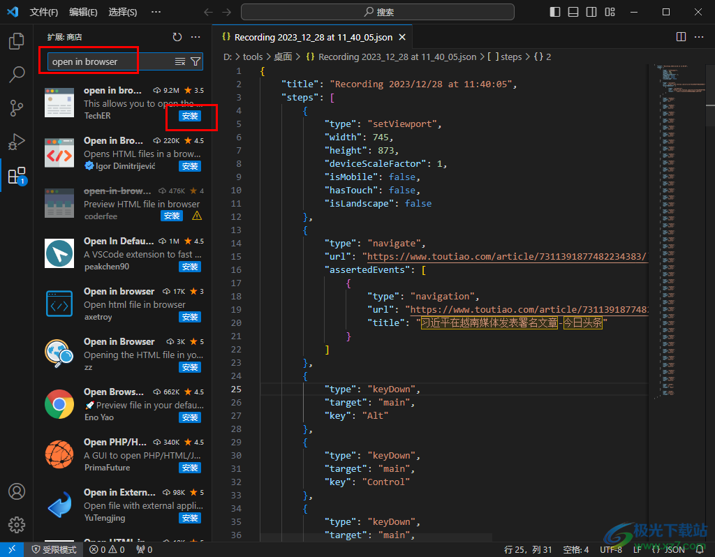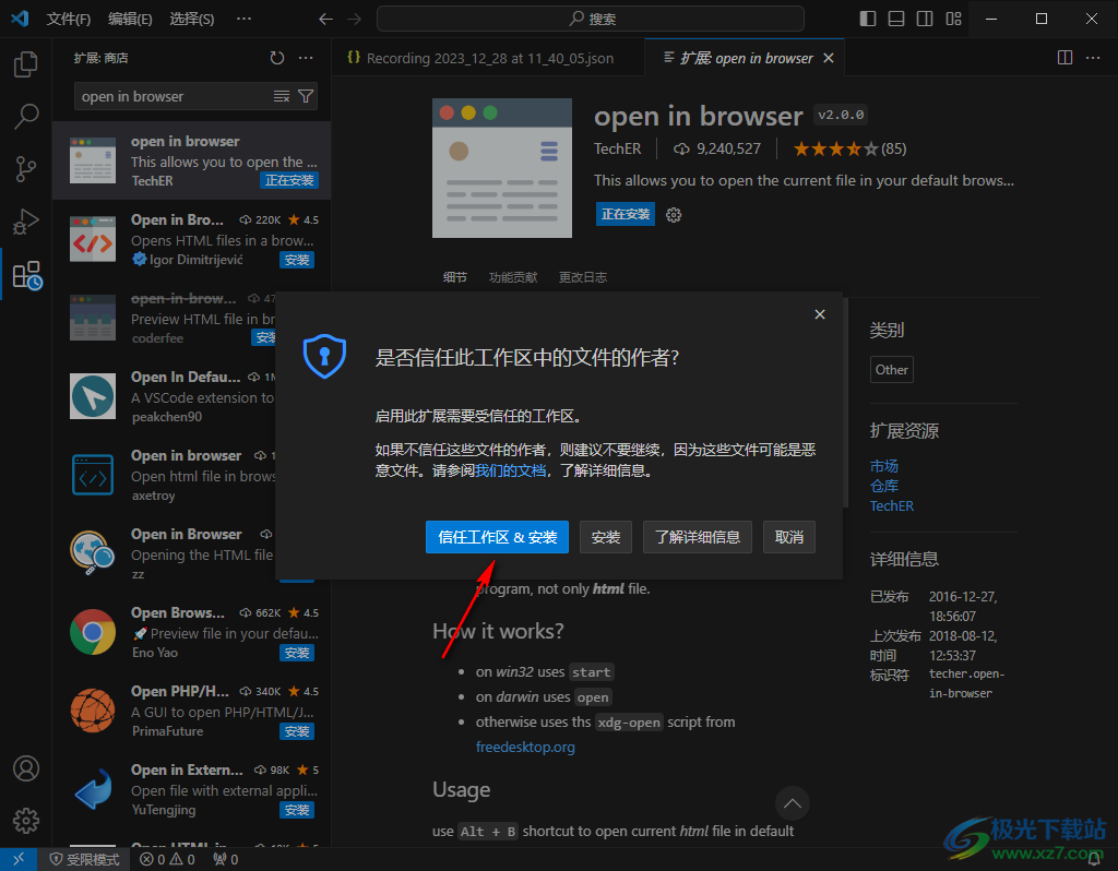 2.之后在搜索框中输入【open in browser】,随后即可弹出相关的选项,点击第一个选项进行安装。