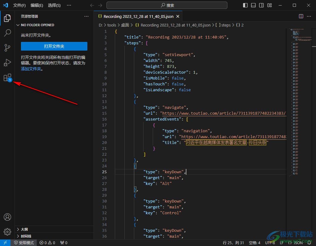 1.首先,我们需要打开Visual Studio Code,之后在页面的左侧工具栏中点击【扩展】图标。
