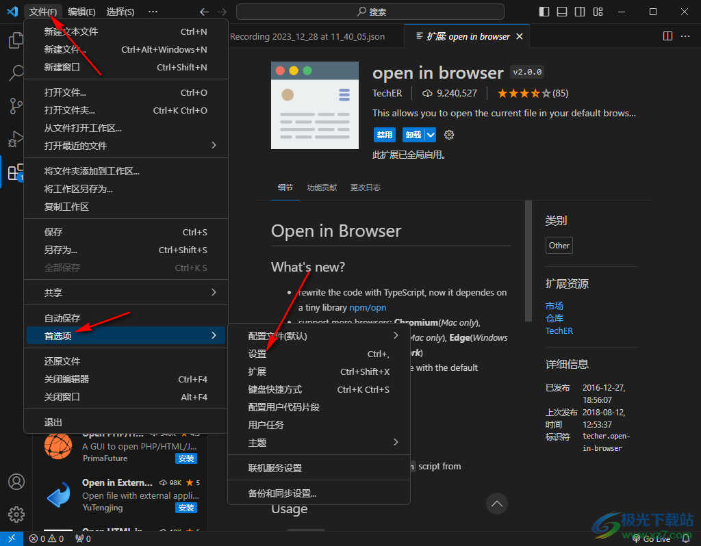 4.安装完成之后,点击页面顶部的【文件】选项,选择【首选项】-【设置】。