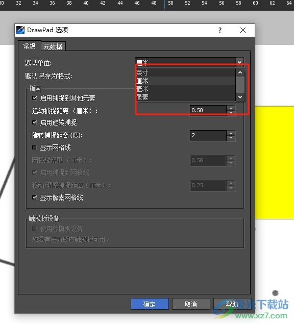 DrawPad是一款易于使用的图像合成和操作程序,它是所有类型的图形设计项目的必备工具,可以让用户应用在草图、徽标、图标以及web图形的绘制,而且里面强大且实用的功能能够很好的满足用户的绘制需求,所以DrawPad软件吸引了不少的用户前来下载使用,当用户在使用DrawPad软件时,想要将其中的默认使用单位进行切换,却不知道怎么来操作实现,其实操作的过程是很简单的,用户打开选项窗口,接着在常规选项卡中点击默认单位选项,然后按需调整默认单位选项即可解决问题,那么接下来就让小编来向大家分享一下DrawPad修改默认使用单位的方法教程吧,希望用户能够从中获取到有用的经验。