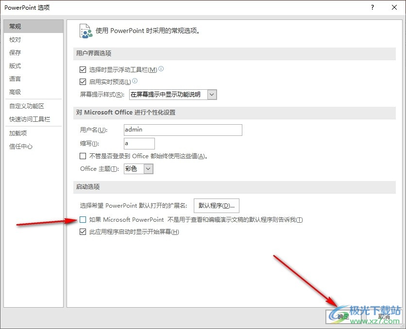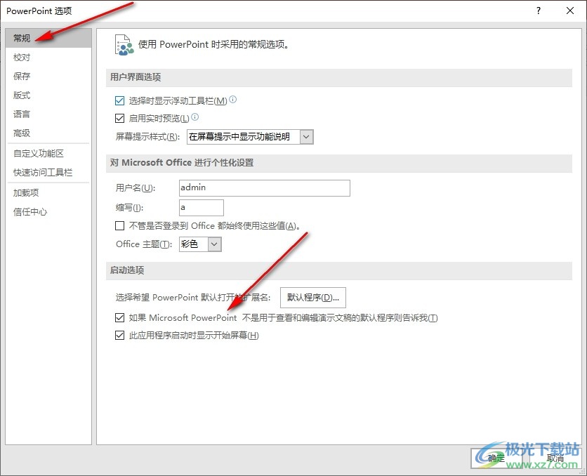 4、第四步,打开“选项”之后,我们在“常规”设置页面中找到“如果Microsoft PowerPoint不是用于查看和编演示文稿的默认程序则告诉我”选项