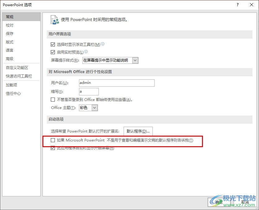 很多小伙伴在使用PPT软件对演示文稿进行编辑的过程中,每次打开PPT程序都会遇到弹框提示我们PPT程序不是演示文稿的默认打开程序,很多小伙伴不知道该怎么关闭该弹框。其实很简单,我们只需要在PPT页面中打开“文件”和“选项”,然后在常规设置页面中找到“如果Microsoft powerpoint不是用于查看和编演示文稿的默认程序则告诉我”选项,将该选项取消勾选,再点击确定选项即可。有的小伙伴可能不清楚具体的操作方法,接下来小编就来和大家分享一下PPT总是提示不是演示文稿默认打开程序的解决方法。