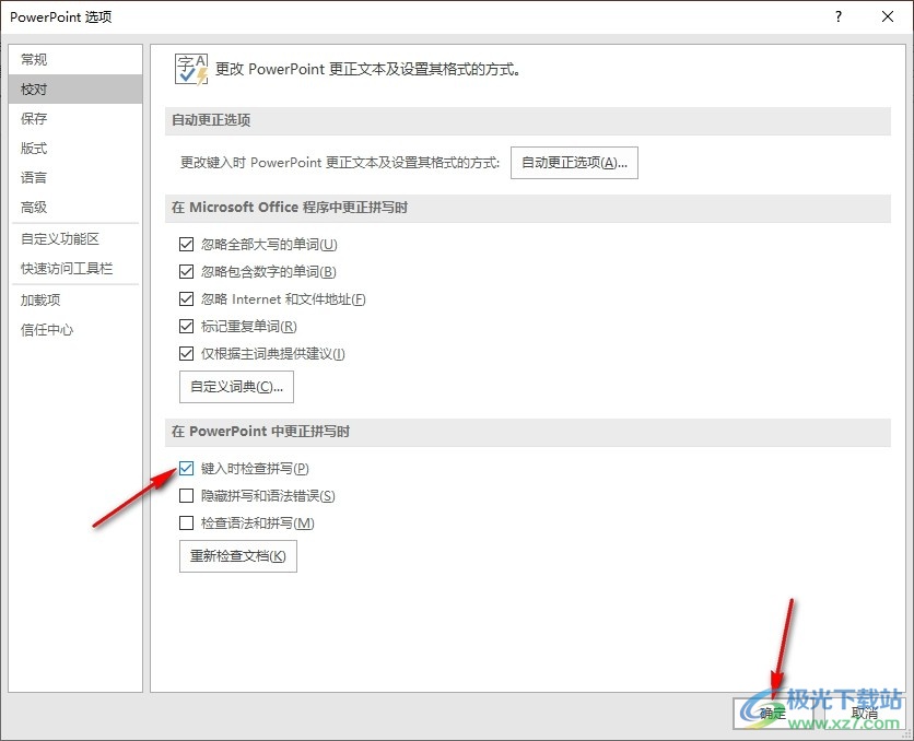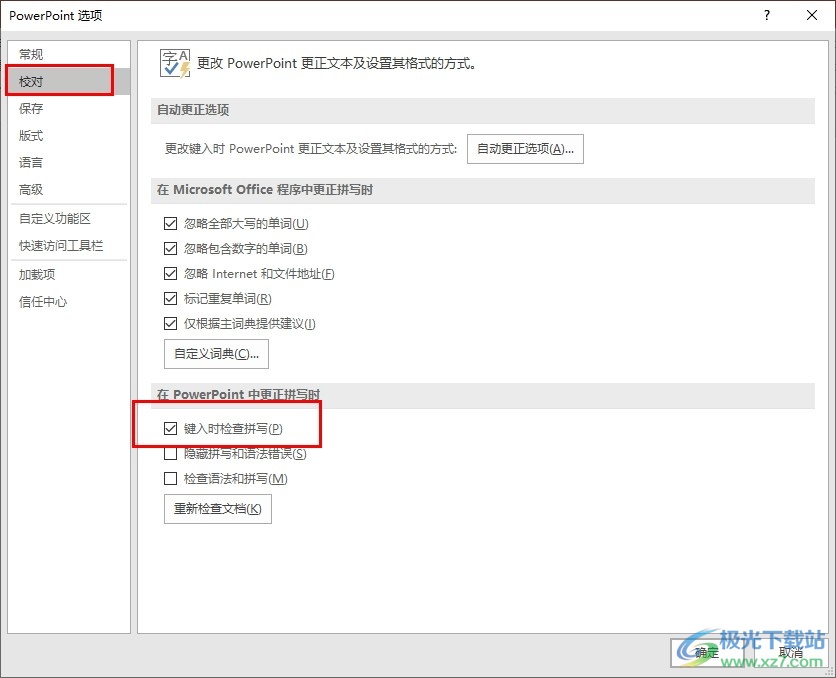 以上就是小编整理总结出的关于PPT幻灯片设置键入时检查拼写的方法,我们进入PPT的PowerPoint选项页面,然后在该页面中点击打开校对设置,接着在校对设置页面中再点击勾选“键入时检查拼写”选项,最后点击确定选项即可,感兴趣的小伙伴快去试试吧。