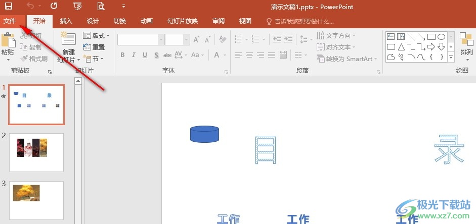 2、第二步,进入演示文稿的编辑页面之后,我们在该页面中点击打开“文件”选项