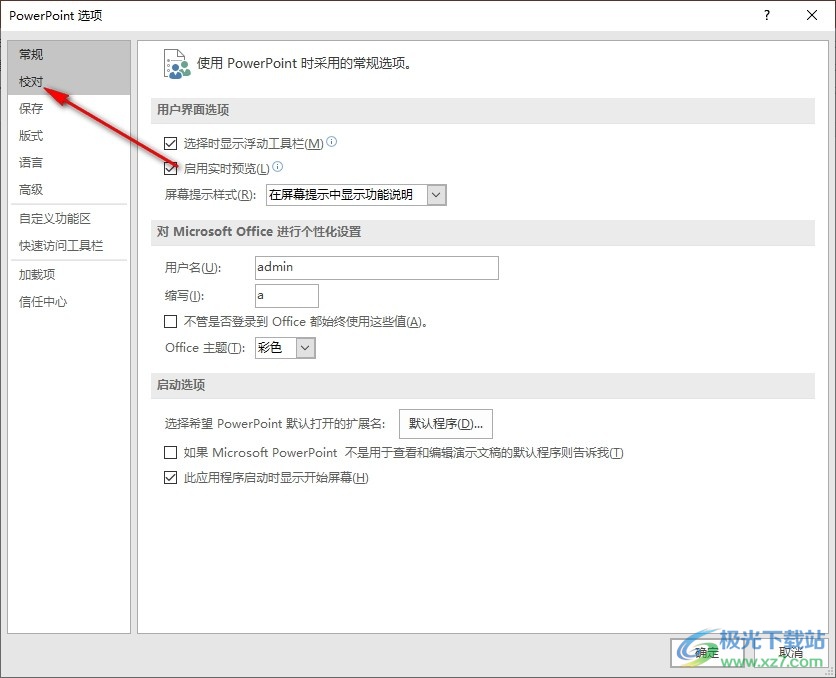 4、第四步,进入PowerPoint选项页面之后,我们在左侧列表中点击打开“校对”选项