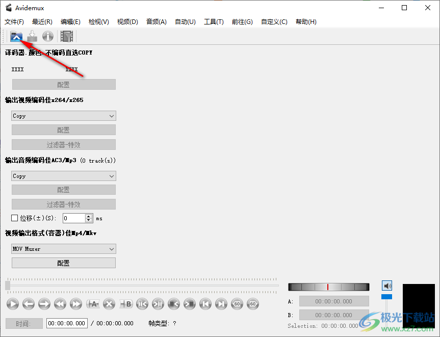 1.当你将Avidemux点击打开之后,在页面的左上角位置点击【开启视频】选项图标。