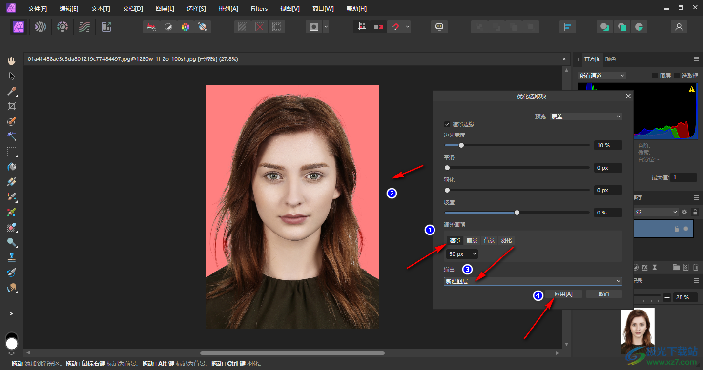 5.即可在页面上打开一个窗口,点击【遮罩】按钮,之后使用鼠标左键在头发的边缘处进行涂抹一下,将一些空隙进行填充,之后将【输出】设置为【新建图层】,再点击【应用】按钮。