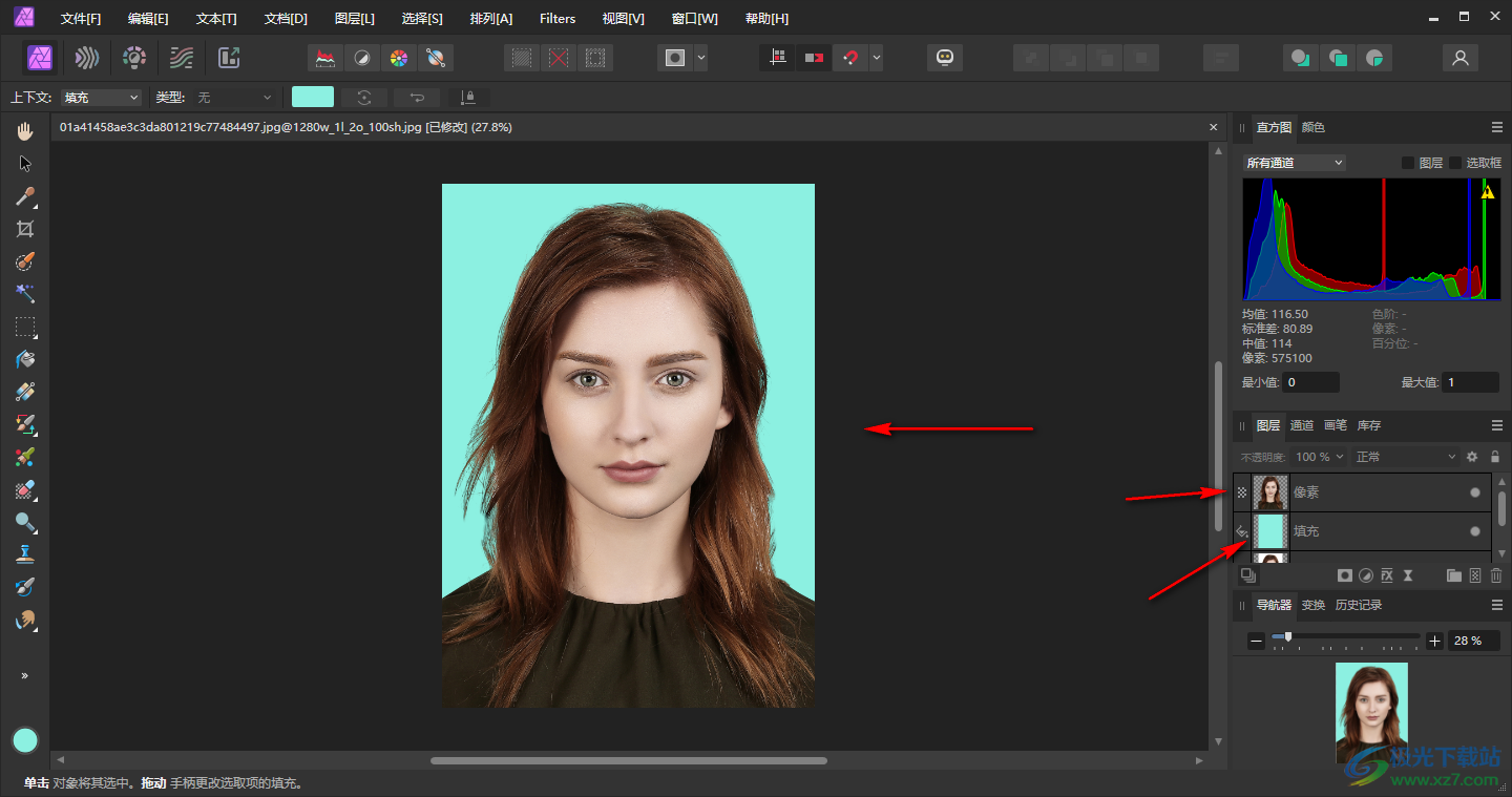 7.我们的填充的图层的背景设置为自己喜欢的颜色,之后在右侧将填充的图层移动到像素图层的下方即可将人像的背景进行更换,如图所示。