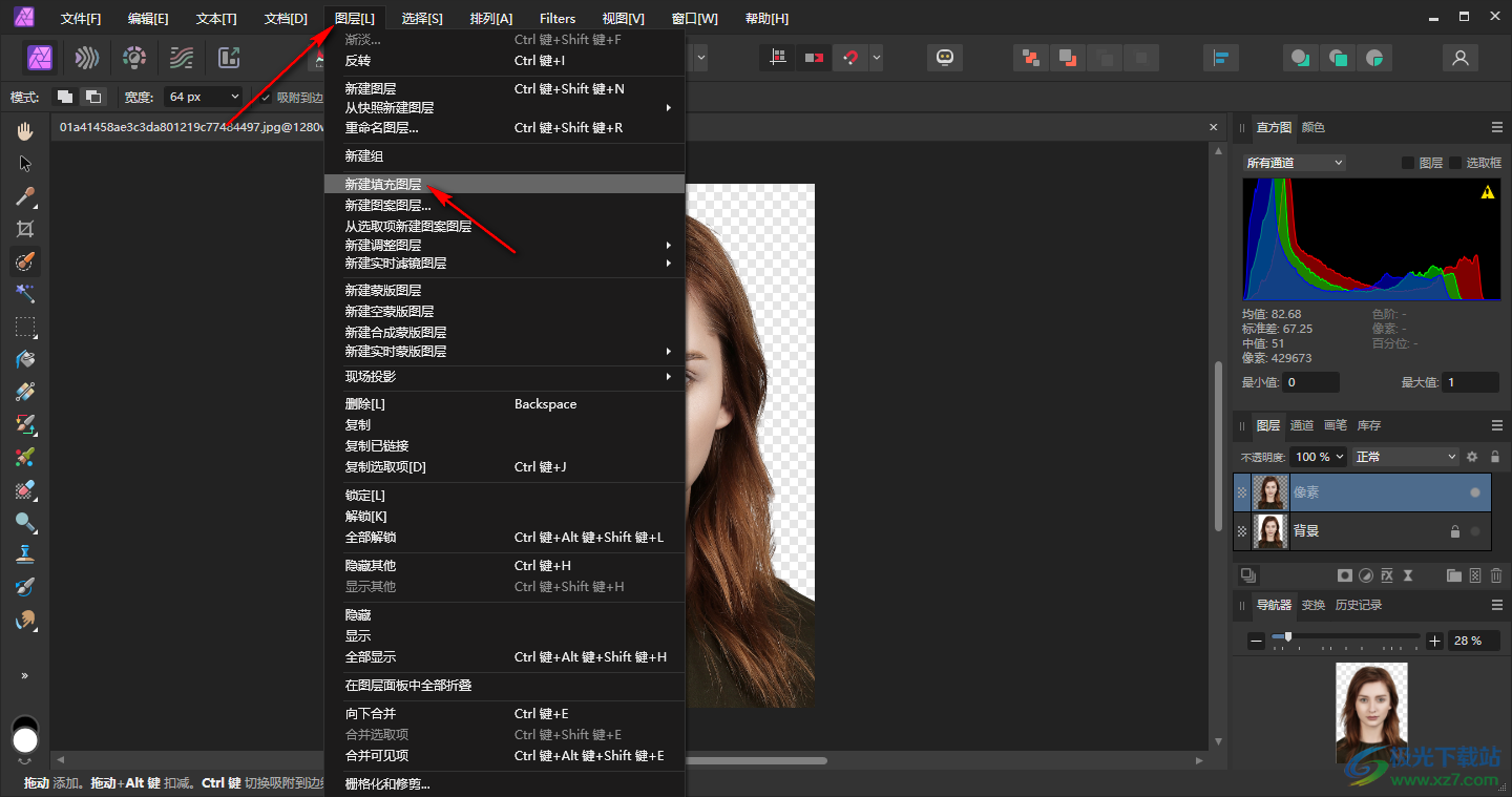 6.这时,再点击【图层】菜单选项卡,选择下拉选项中的【新建填充图层】选项。