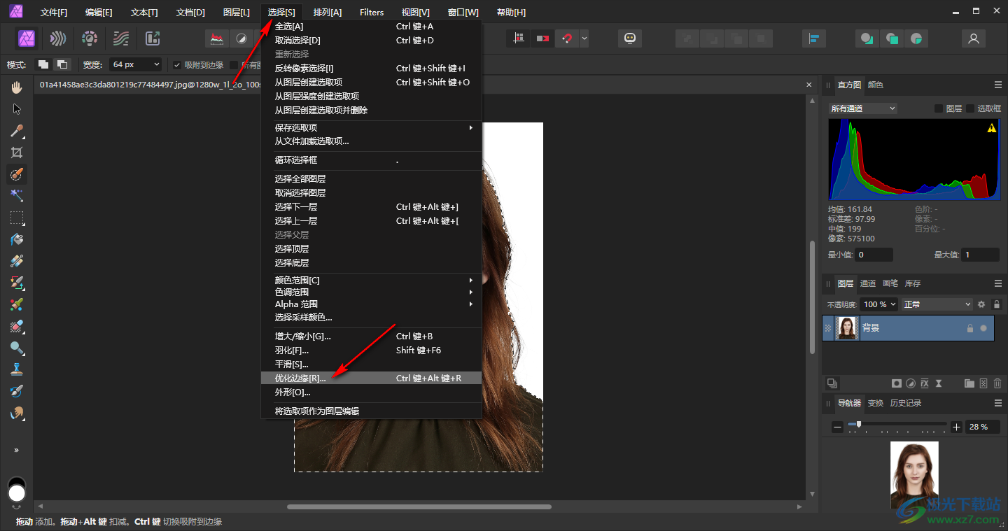 4.这时,我们再点击一下【选择】选项,随后即可打开一个下拉选项,将其中的【优化边缘】选项进行左键点击。