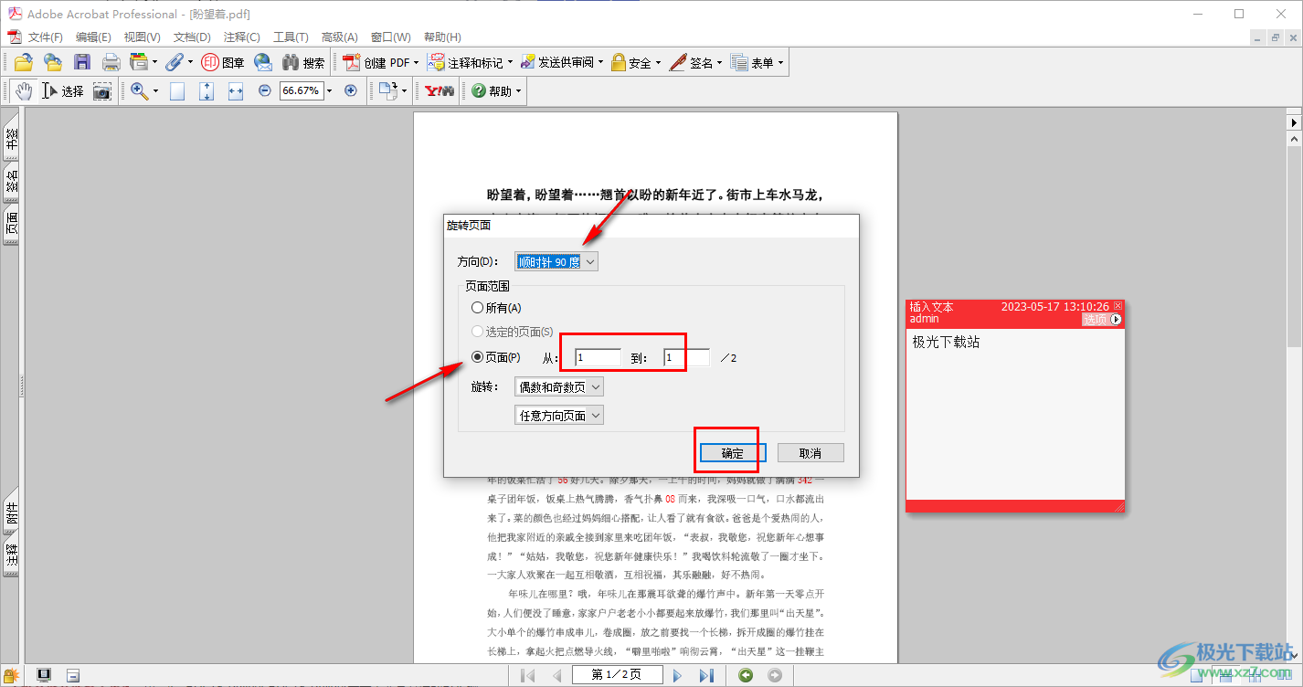4.随后即可在页面上弹出一个设置页面旋转的窗口,可以自定义设置旋转的度数,之后勾选【页面】,选择自己想要设置旋转的页数,之后点击确定按钮。