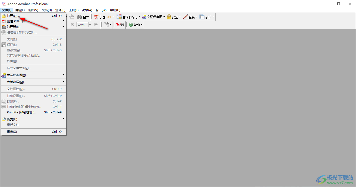 1.当我们进入到adobe acrobat 7.0中之后,在页面的左侧上方的位置点击【文件】选项,点击【打开】选项进行PDF文件的添加。