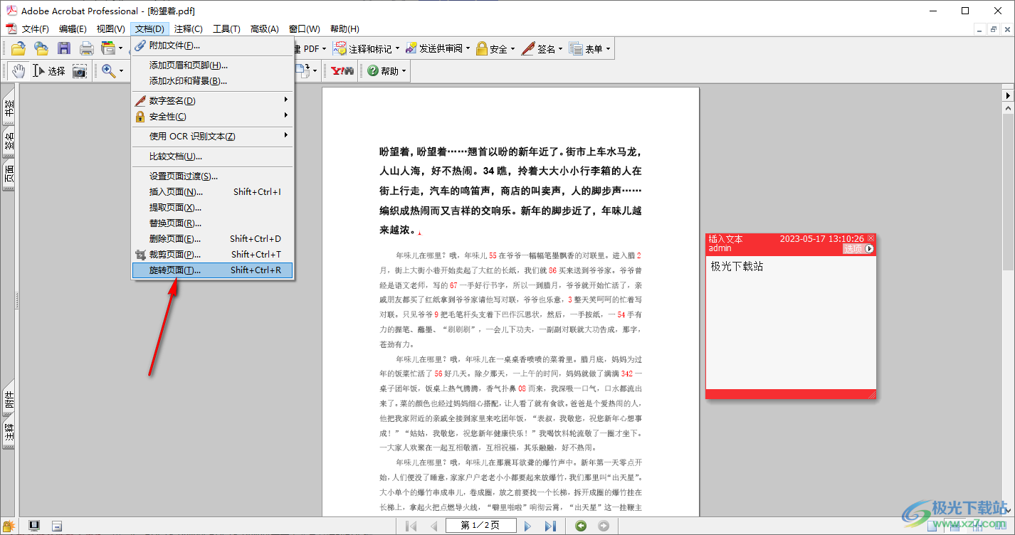 3.随后即可查看到弹出的子选项,在子选项中将最后一个【旋转页面】选项进行左键点击打开。
